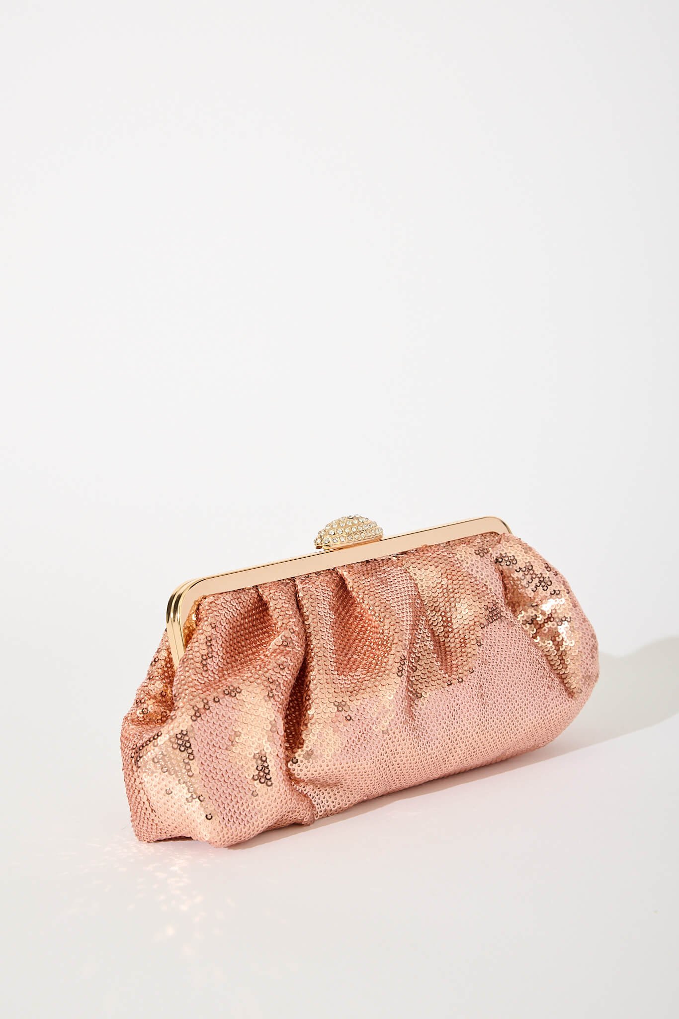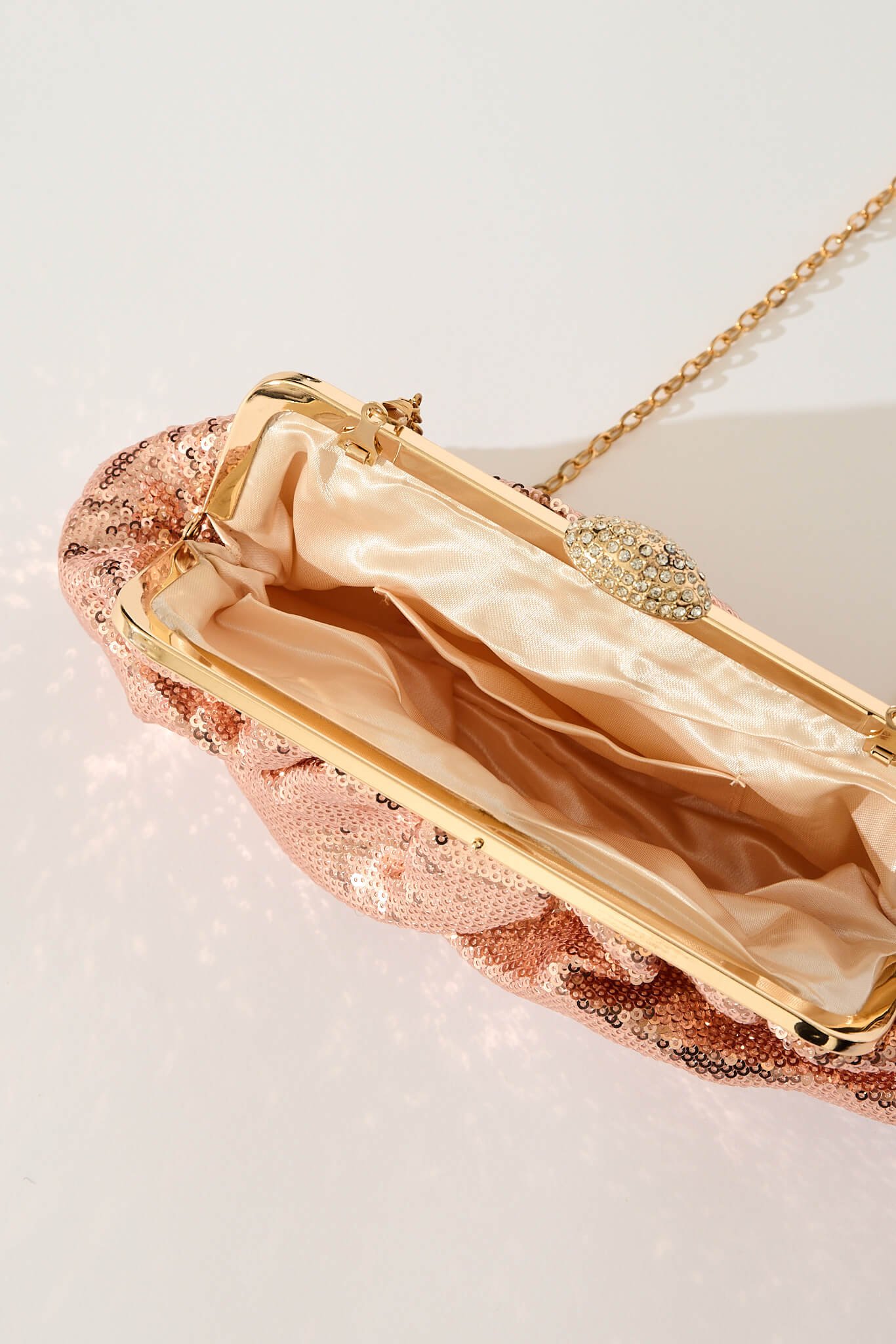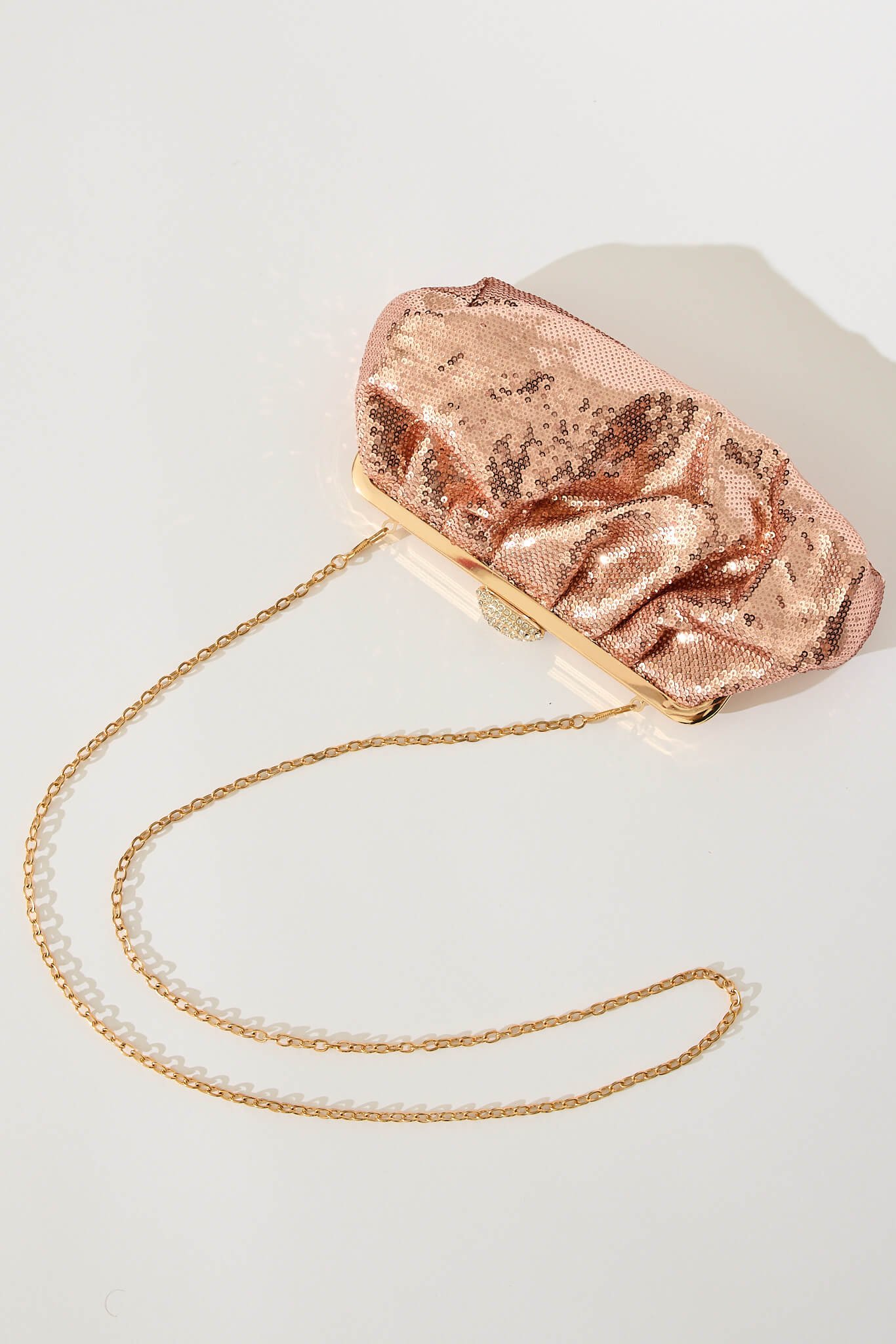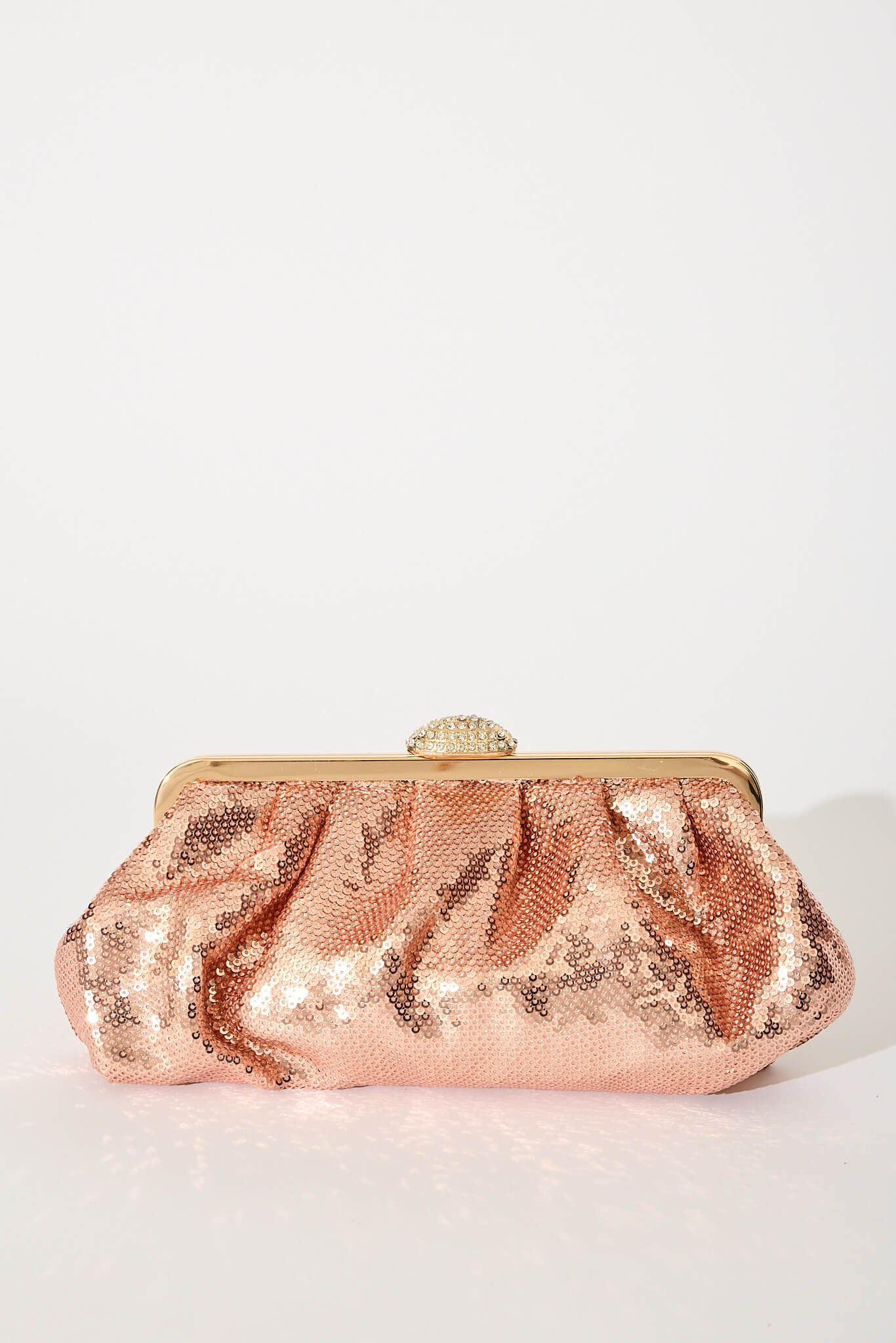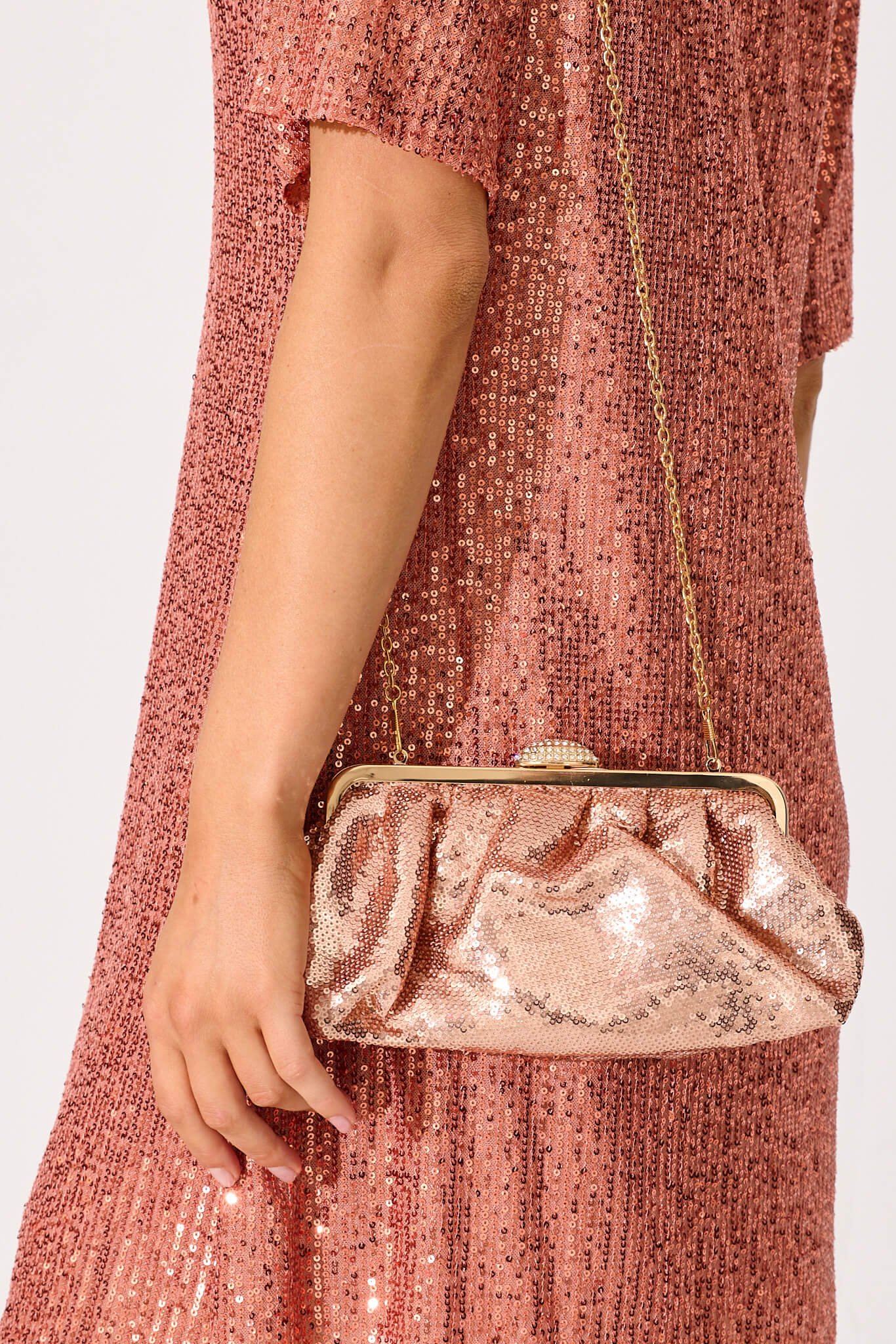 Welcome to sparkle season! Add a pop of colour to your evening accessories with our Clutch Bag in Rose Gold Sequin.