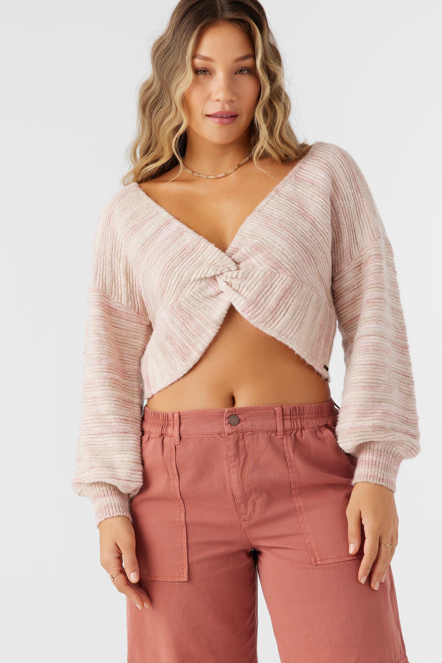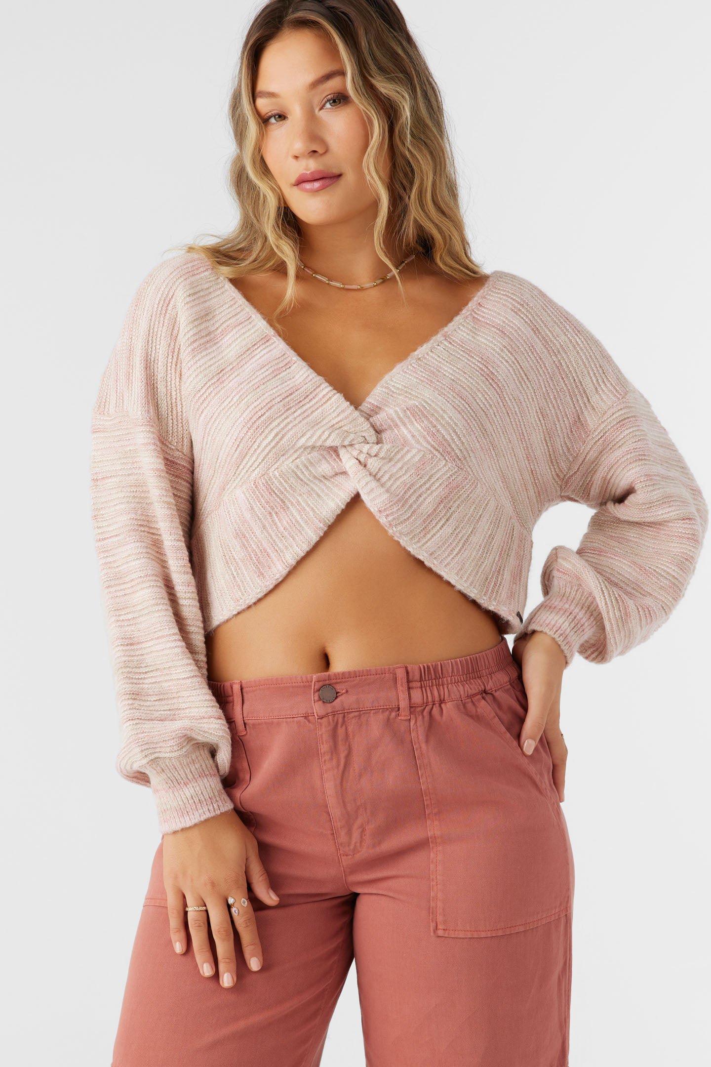 Cozy knit sweater that has a twist front design, skimmer length fit and drop shoulder detail. Wear and style two ways.