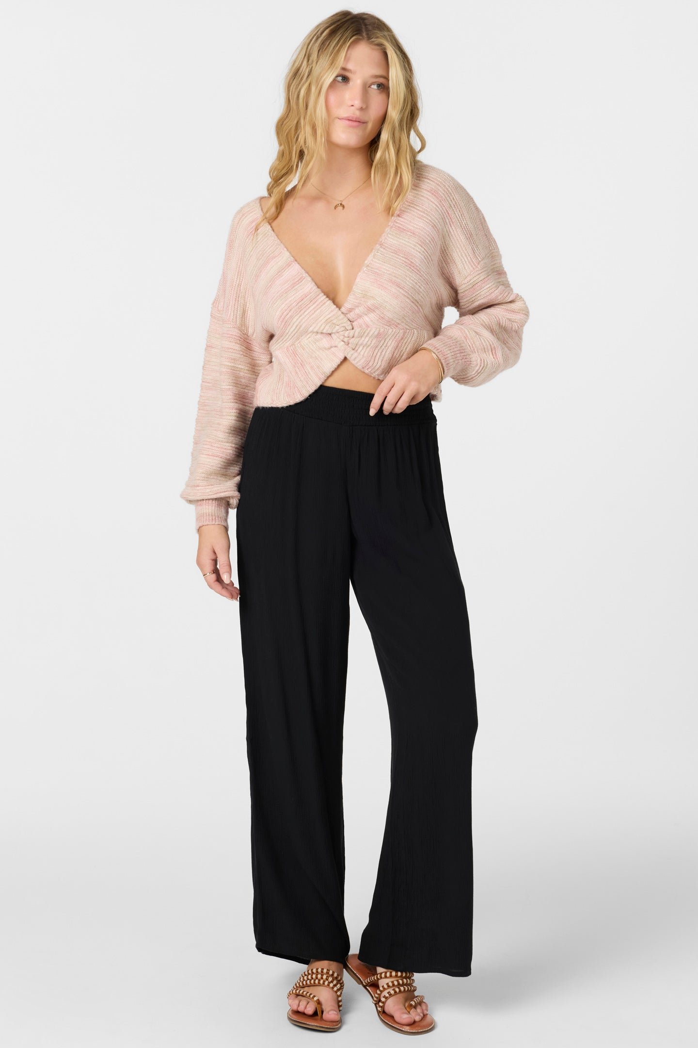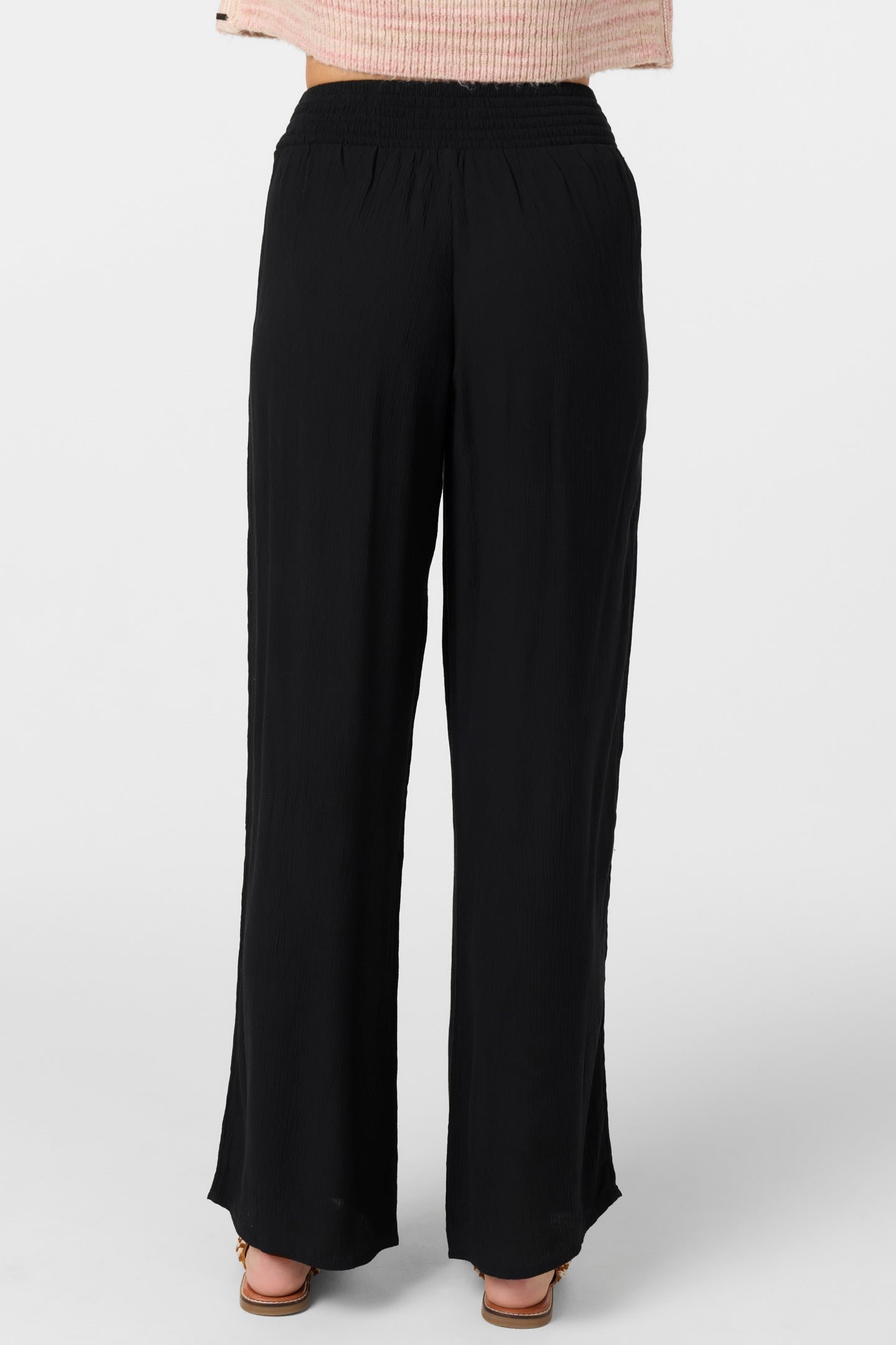 Cute and comfy woven pull-on pant that has a smocked elastic waistband, flowy fit and solid color wash.